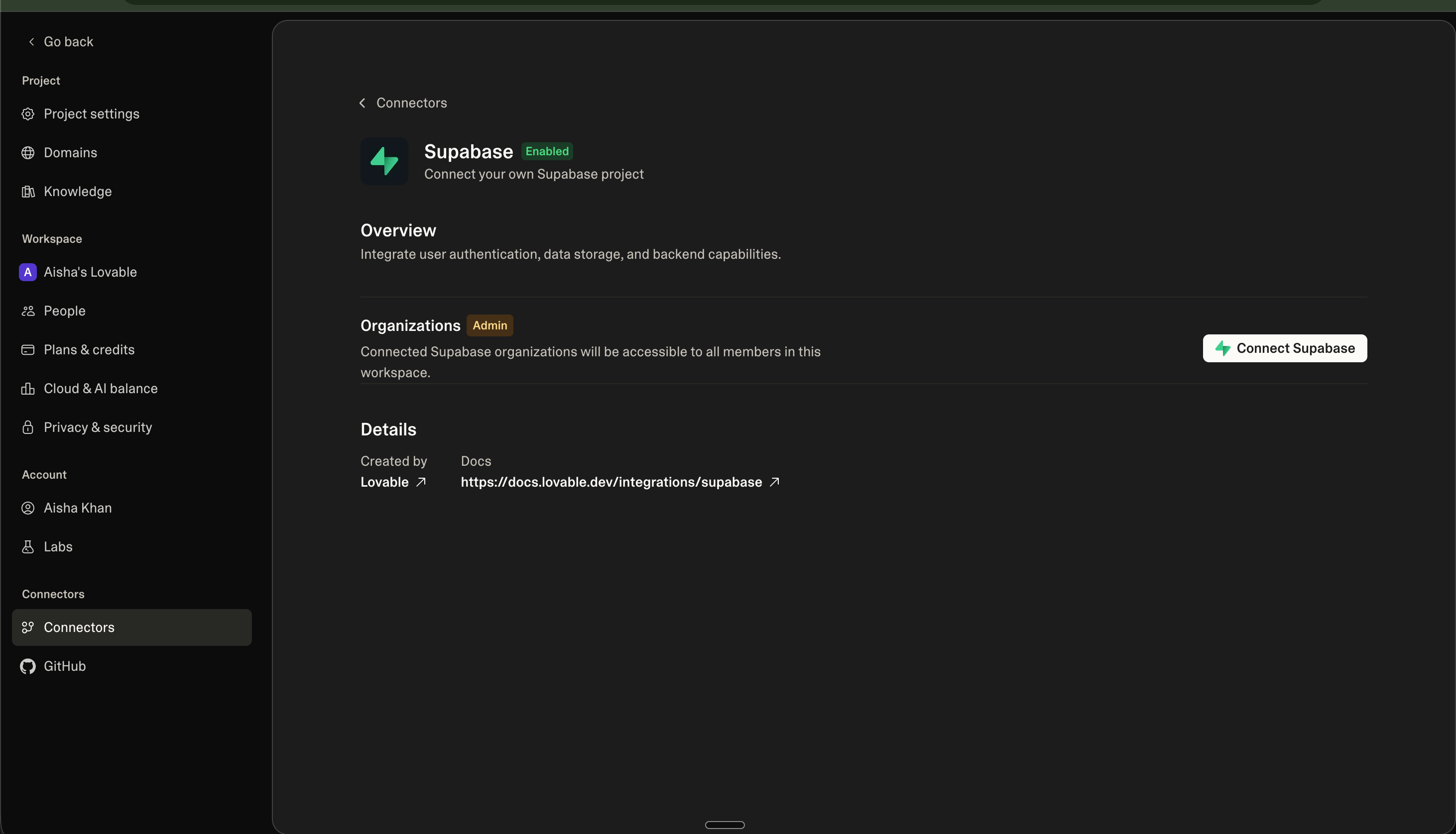 Look for the “Connectors” > “Supabase” tab.