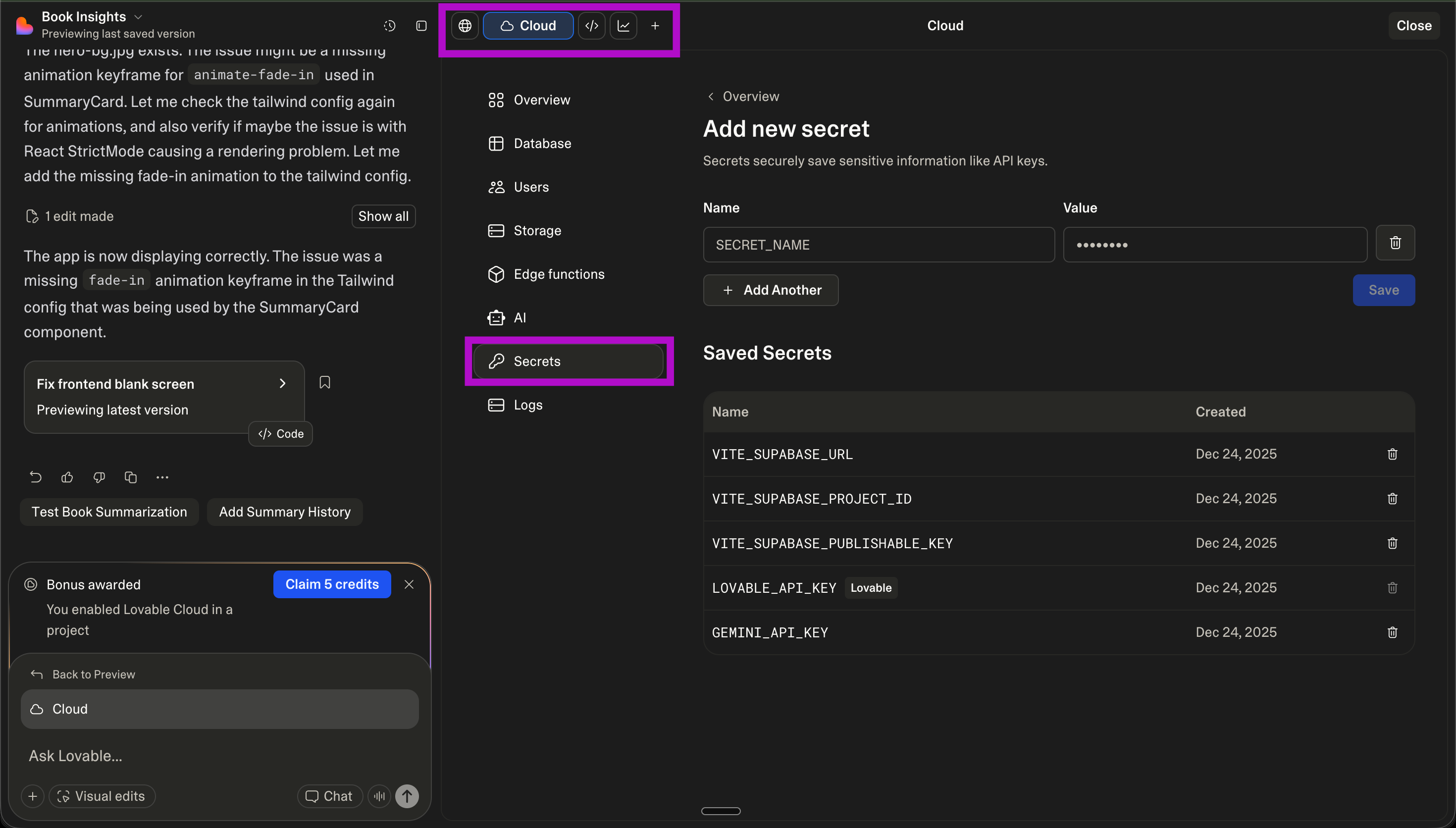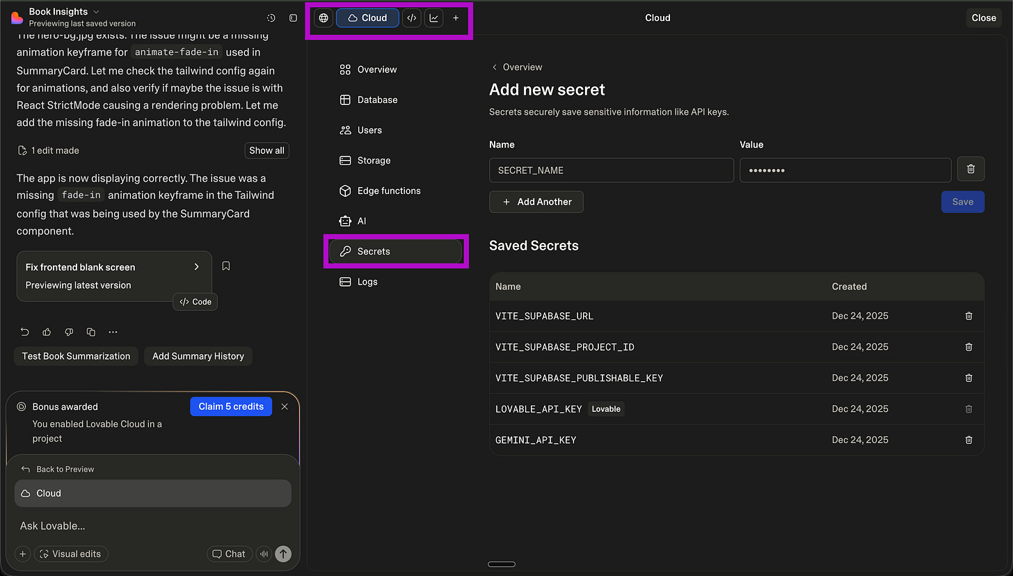 Tell Lovable: “I want to create a ‘profiles’ table that stores the user’s name, bio, and total AI credits. Link it to the auth system.”