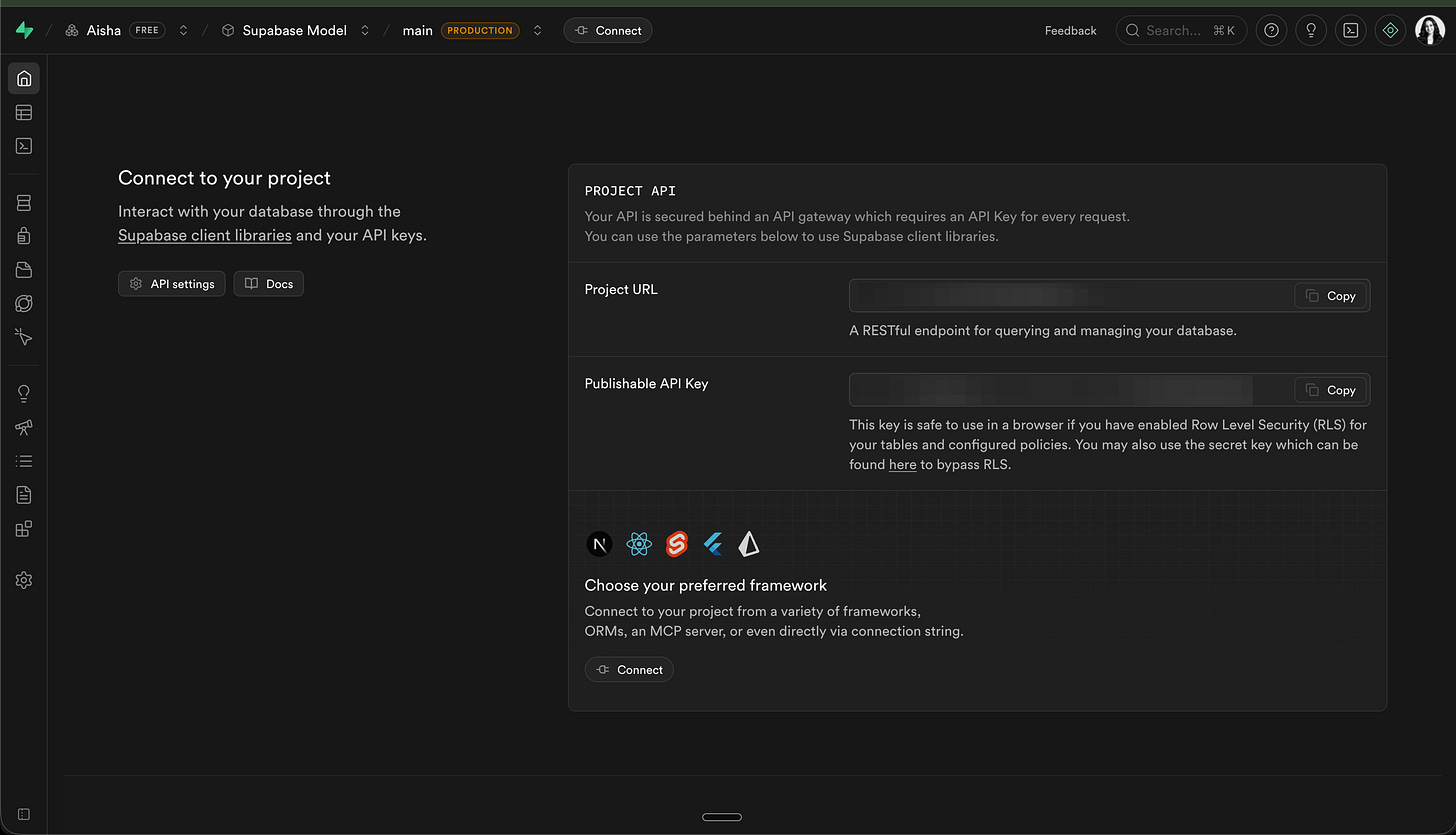 Paste the URL. Paste the Key. Alternatively, you can connect to Supabase directly from here.